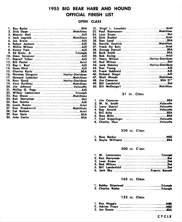 The Big Run of 1961 began with a false start and a re-start, and ended with so much confusion, the results were declared unofficial. The last Big Bear was apparently 1963, in which Bud Ekins won on a 650 Triumph...